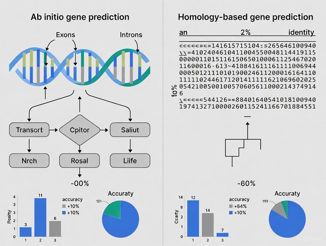 Gene prediction is a cornerstone of modern genomics, enabling researchers to identify the precise location and structure of protein-coding genes within raw DNA sequences [33]. The accuracy of this process is paramount, as the resulting gene models form the foundation for downstream analyses in fields ranging from personalized medicine to agricultural biotechnology [35]. Currently, two primary computational approaches dominate the field: ab initio (or de novo) prediction and homology-based (or comparative) prediction. Ab initio methods identify genes based solely on intrinsic sequence features and statistical models of coding regions, requiring no prior experimental data or knowledge of similar genes [37] [5]. In contrast, homology-based approaches leverage evolutionary conservation, using known genes from related organisms as templates to identify similar genes in a target genome [50] [4].