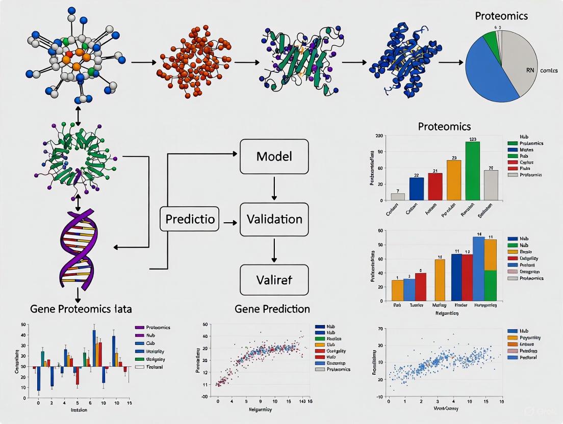 The integration of proteomic data is a cornerstone for the robust validation of computational gene predictions, transforming hypothetical models into biologically and therapeutically relevant knowledge. As demonstrated, this process is not merely a confirmatory step but a powerful discovery engine that reveals functional protein signatures, clarifies disease mechanisms, and directly informs drug development—from identifying novel biomarkers to determining the correct direction of therapeutic effect. Future progress hinges on continued methodological refinements in mass spectrometry sensitivity, the development of standardized and optimized bioinformatic workflows, and the systematic integration of multi-omics data. For biomedical research, this disciplined approach to validation is paramount for successfully translating the vast promise of genomics into tangible clinical applications and effective new therapies.