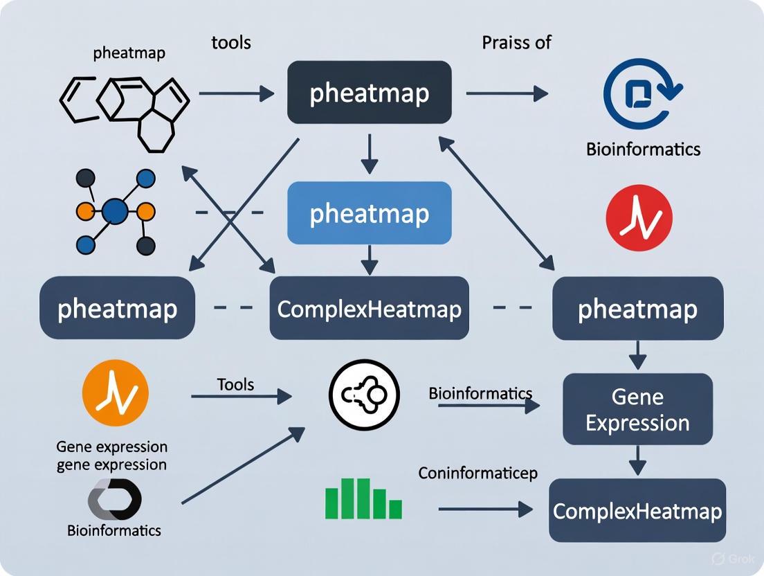 Within the R ecosystem, several packages have emerged for heatmap generation, with pheatmap and ComplexHeatmap representing two of the most prominent solutions used in genomic research. While pheatmap offers a straightforward approach to creating publication-quality heatmaps, ComplexHeatmap provides enhanced flexibility for visualizing multiple datasets and annotations simultaneously. This comparison guide objectively evaluates these tools within the context of genomic data analysis, focusing on performance characteristics, feature sets, and practical applications in gene expression studies.